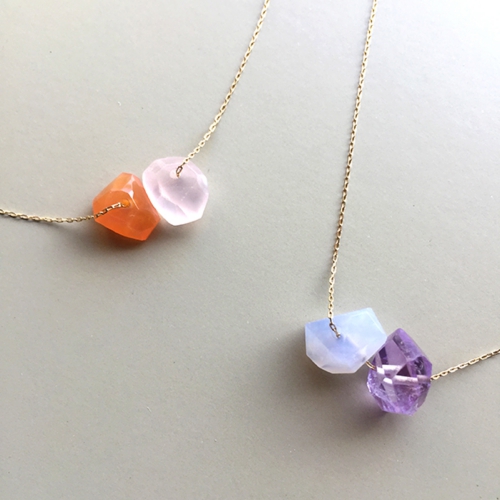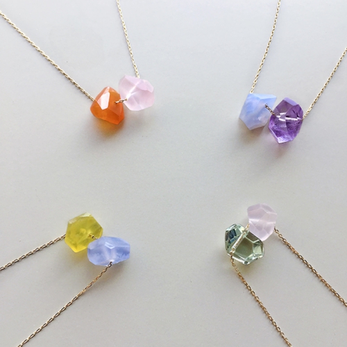 ドロップキャンディーのようなカラフルで美味しそうな宝石。ピーチ・グレープ・オレンジ・パイン・キウイ・プラムなど、本物のドロップキャンディーの色と味のイメージを合わせています。石はラフカットという直線的でランダムなカットで、可愛らしさと格好良さがバランスよく組み込まれたジュエリーです。