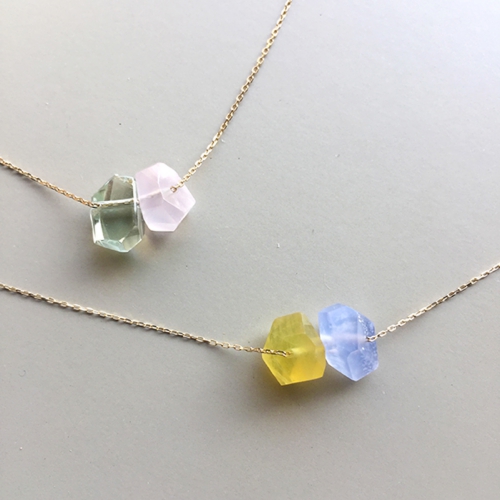 カラフルで美しいキャンディーのような宝石のピアスとネックレス。宝石の一部に曇り加工を施した、輝きとフォルムのコントラストが斬新なデザイン。ピアスはデザイナーが横顔を美しく見せることにこだわった一品。宝石が横から見た時に正面に見えるようになっています。また、石を留める台座を無くしてチェーンや金具をダイレクトに石につなげることにより、宝石本来の輝きが耳や首元に光ります。さらにパールキャッチのピアスで後ろ姿も美しく、パールキャッチをフロントに持ってくることでリバーシブルのピアスとしてもお楽しみ頂けます。