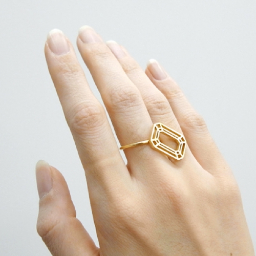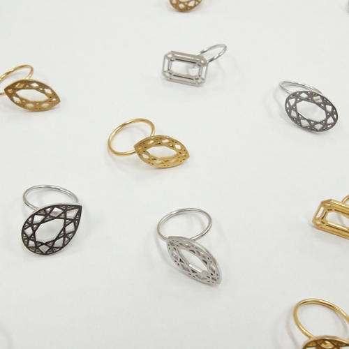 宝石のカットをそのままジュエリーにしたグラフィカルなデザインのリングとピアス。リングは身につけると指から今にもこぼれ落ちそうに指と指の間に宝石がくるデザインが魅力です。ピアスは身につけると正面はシンプル、横からみるとカットが見えてくる2面性が面白いデザインです。宝石カットの基本形であるエメラルドカット・オーバルカット・マーキースカット・ペアシェイプカットの4種類の展開です。