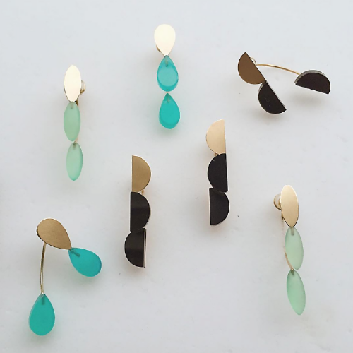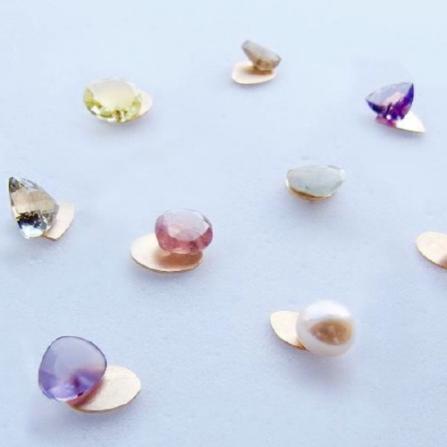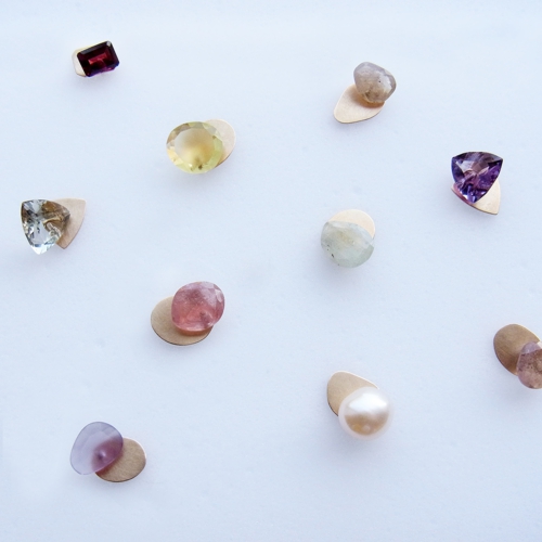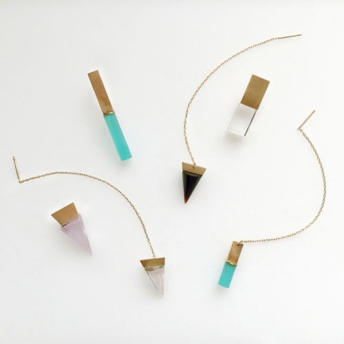 マル・サンカク・シカクから構成された幾何形態の天然石を使ったシリーズ。宝石のカタチからそのまま伸びたゴールドプレートがアクセントに。シンプルな形ながら存在感のあるジュエリーです。