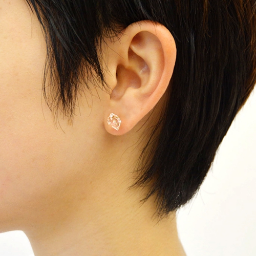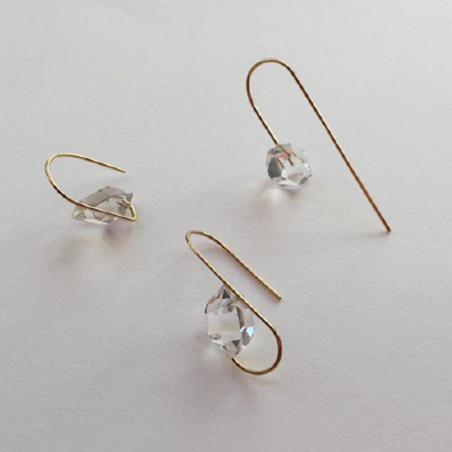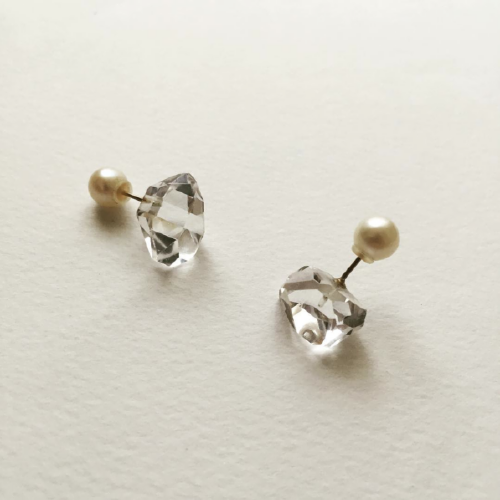 ハーキマークォーツとは、アメリカのニューヨーク州ハーキマー地方で採掘される水晶です。結晶の両端が尖った形で、ダイヤモンドのように強く美しく光輝くことから、ハーキマーダイヤモンドとも呼ばれています。yull.ではこのハーキマークォーツの中でも特に透明度の高い上質なものを選んでジュエリーにしています。無色透明ですがとても輝きが強いため存在感があり、どんなファッションにも合う万能ジュエリーです。サイズはSサイズとLサイズの展開で、Lサイズはパールをフロントに持ってくることで、石の先端が耳たぶからチラリと顔を出します。※ピアスホールが下にある方に限ります。