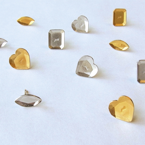 エメラルドカットやハートシェイプ、マーキースカット。大切な卵を守るように、大切な宝石を守る殻をイメージしています。宝石を凹みで表現した宝石の抜け殻のようなシリーズです。シルバーにゴールドのコーティングタイプと、変色しにくいようにロジウムコーティングを施した2パターンの展開です。パールキャッチのピアスで後ろ姿も美しく、パールキャッチをフロントに持ってくることでリバーシブルのピアスとしてもお楽しみ頂けます。