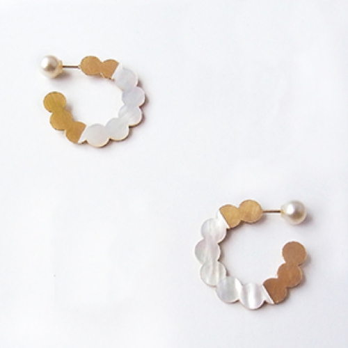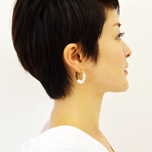 bi-colorとは2色という意味。素材の持つ色に着目し、宝石のシルエットをバイカラーで表現したグラフィカルなデザインのピアス。貝の白く優しい輝きが女性の品の良さを引き立たせます。大きめのパールキャッチで後ろ姿も美しく、キャッチをフロントに持ってくることで、耳たぶからさり気なくゴールド色のプレートが顔を出します。デザインがガラリと変わる2WAYデザインのピアスとしてお楽しみ頂けます。