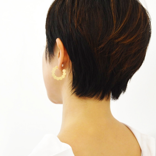 1つのカタチが連続していくことで新しいカタチになる。そんなところに着目して生まれたシリーズ。1番下の石がキャッチとつながっており、少し奥まってセッティングされているので、不思議な立体感のピアスです。キャッチについた石がずれることでまた新しいカタチに変化しますので、色々なデザインの表情をお楽しみいただけます。
